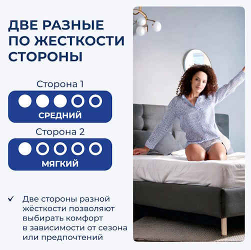 Матрас Demetra с разной жесткостью сторон. Он создан на основе армированного блока независимых пружин MAGNIFICA, в котором на одно спальное место приходится 500 пружин. Каждая пружина находится в индивидуальном чехле и точечно подстраиваются под контур тела спящего, обеспечивая правильную поддержку позвоночника.