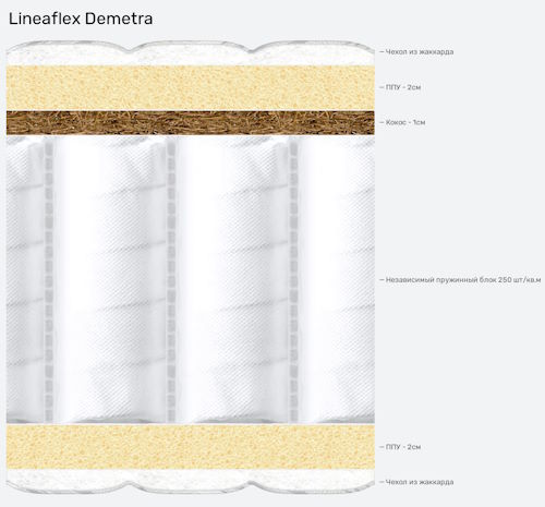 Lineaflex Demetra (Деметра) - матрас с ортопедическими свойствами бренда Lineaflex толщиной 20 сантиметров, предназначен для взрослой кровати, под максимальную нагрузку 120 килограммов.