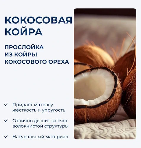 Наполнитель матраса – кокосовая койра (50% латекса). Чехол выполнен из мягкого и приятного на ощупь высококачественного жаккарда (в составе 40% хлопка). Имеет белый цвет с перламутровым отливом. Стежка – гипоаллергенный и экологически чистый файбер. Рекомендуемая нагрузка до 120 кг.