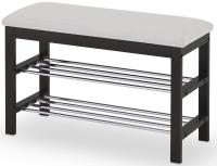 Полка для обуви ST-3  – практичная подставка для обуви с мягким сидением польской компании Halmar, состоящая из двух полок. Каркас изготовлен из массива натурального дерева цвета венге. Каждая полочка представлена в виде четырех хромированных стальных труб, расположенных в ряд. Наличие сидения, обитого экокожей кремового цвета, добавляет комфорта.